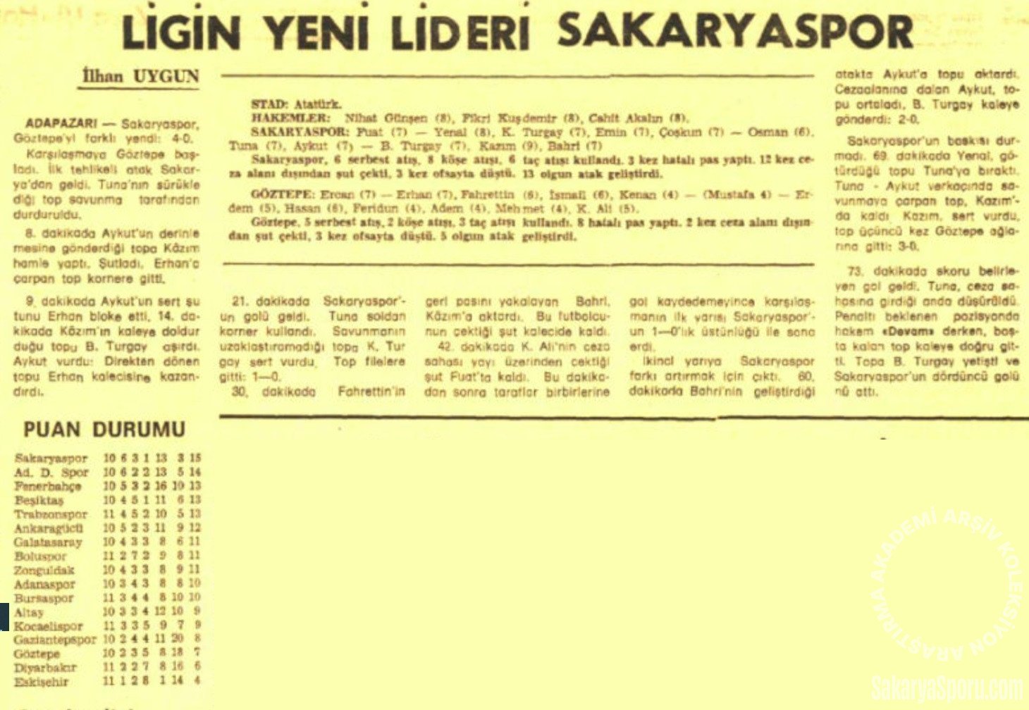 21.dakikada Sakaryaspor’un golü geldi. Tuna soldan korner kullandı. Savunmanın uzaklaştırmadığı topa K.Turgay sert vurdu. Top filelere gitti. 1-0
