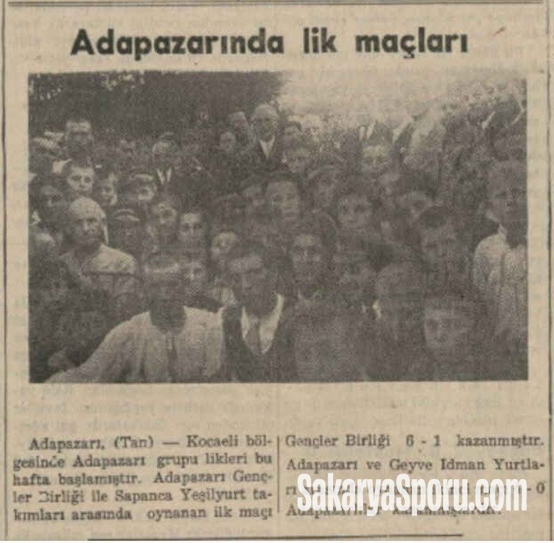 Adapazarı. (Tan) — Kocaeli bölgesi Adapazarı grubu ligleri bu hafta başlamıştır. Adapazarı Gençlerbirliği, Sapanca Yeşilyurt takımları arasında oynanan ilk maçı Gençlerbirliği 0-1 kazanmıştır. Adapazarı ve Geyve idman Yurdu arasında oynanan maçı 4-0 Adapazarlılar kazanmışlardır.