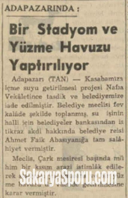 Adapazarı (TAN) — Kasabanın içme suyu gelmesi projesi Nafıa Vekâletince tasdik ve belediyemize iade edilmiştir. Belediye meclisi fevkalâde şekilde toplanmış su işinin halli için belediyeler bankasından istikraz akdi hakkında belediye reisi Ahmet Faik Abasıyanık’a tam salâhiyet vermiştir.