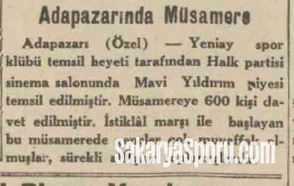 Adapazarı (özel) — Yeniay spor klübü temsil heyeti tarafından Halk Partisi sinema salonunda Mavi Yıldırım piyesi temsil edilmiştir. Müsamereye 600 kişi davet edilmiştir. İstiklâl marşı ile başlayan bu müsamerede gençler çok muvaffak olmuşlar, sürekli alkışlar toplamışlardır.