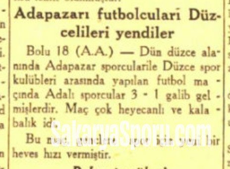 Bolu 18 (A.A.) — Dün Düzce alanında Adapazarı sporcuları ile Düzce spor kulüpleri arasında yapılan futbol maçında Adalı sporcular 3-1 galip gelmişlerdir. Maç çok heyecanlı ve kalabalık idi.