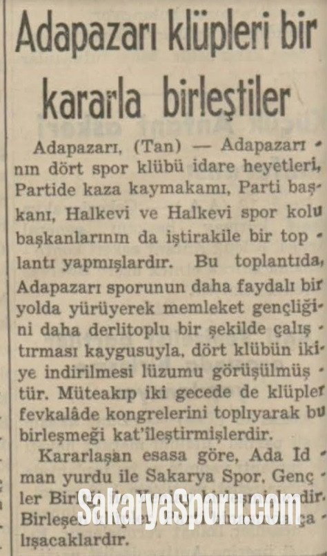 Kararlaşan esasa göre, Ada(pazarı) İdman yurdu ve Sakaryaspor. Gençlerbirliği ile Yeniay birleşmişlerdir. Birleşen kulüpler, parti binasında çalışacaklardır.