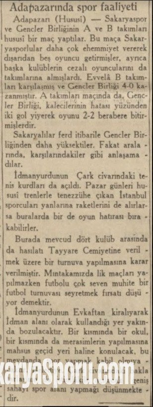 Adapazarı (Hususî) — Sakaryaspor ve Gençlerbirliğinin A ve B takımları hususî bir maç yaptılar. Bu maça Sakaryasporlular daha çok ehemmiyet vererek dışarıdan beş oyuncu getirmişler, ayrıca başka kulüplerin cezalı oyuncularını da takımlarına almışlardı. Evvelâ B takımları karşılaşmış ve Gençlerbirliği 4-0 kazanmıştır. A takımları maçında da. Gençlerbirliği, kalecilerinin hatası yüzünden iki gol yiyerek oyunu 2-2 berabere bitirmişlerdir.