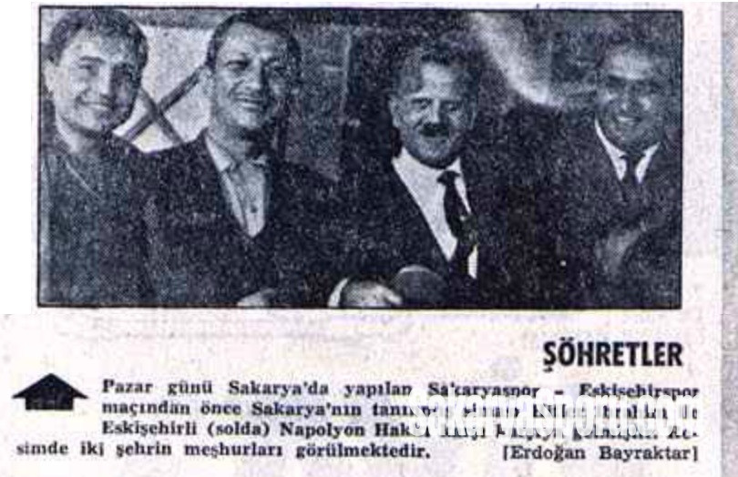 Pazar Sakarya’da yapılan Sakaryaspor - Eskişehirspor maçından önce Sakarya'nın tanınmış siması Hitler İbrahim İle Eskişehirli (solda) Napolyon Hakkı karşı karşıya gelmiştir. Resimde iki şehrin meşhurları görülmektedir. (Erdoğan Bayraktar)