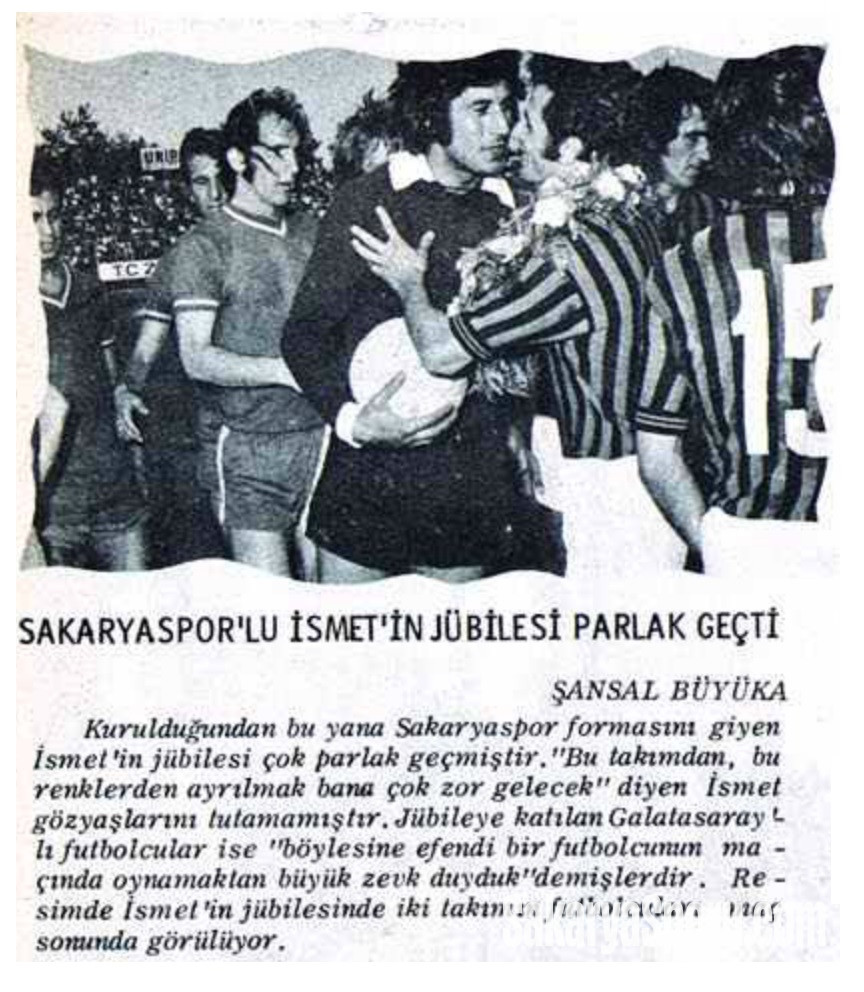 Kurulduğundan bu yana Sakaryaspor formasını giyen İsmet’in jübilesi çok parlak geçmiştir. "Bu takımdan, bu renklerden ayrılmak bana çok zor gelecek" diyen İsmet gözyaşlarını tutamamıştır .Jübileye katılan Galatasaraylı futbolcular ise "böylesine efendi bir futbolcunun maçında oynamaktan büyük zevk duyduk" demişlerdir. Resimde İsmetin jübilesinde iki takımın futbolcuları maç sonunda görülüyor.