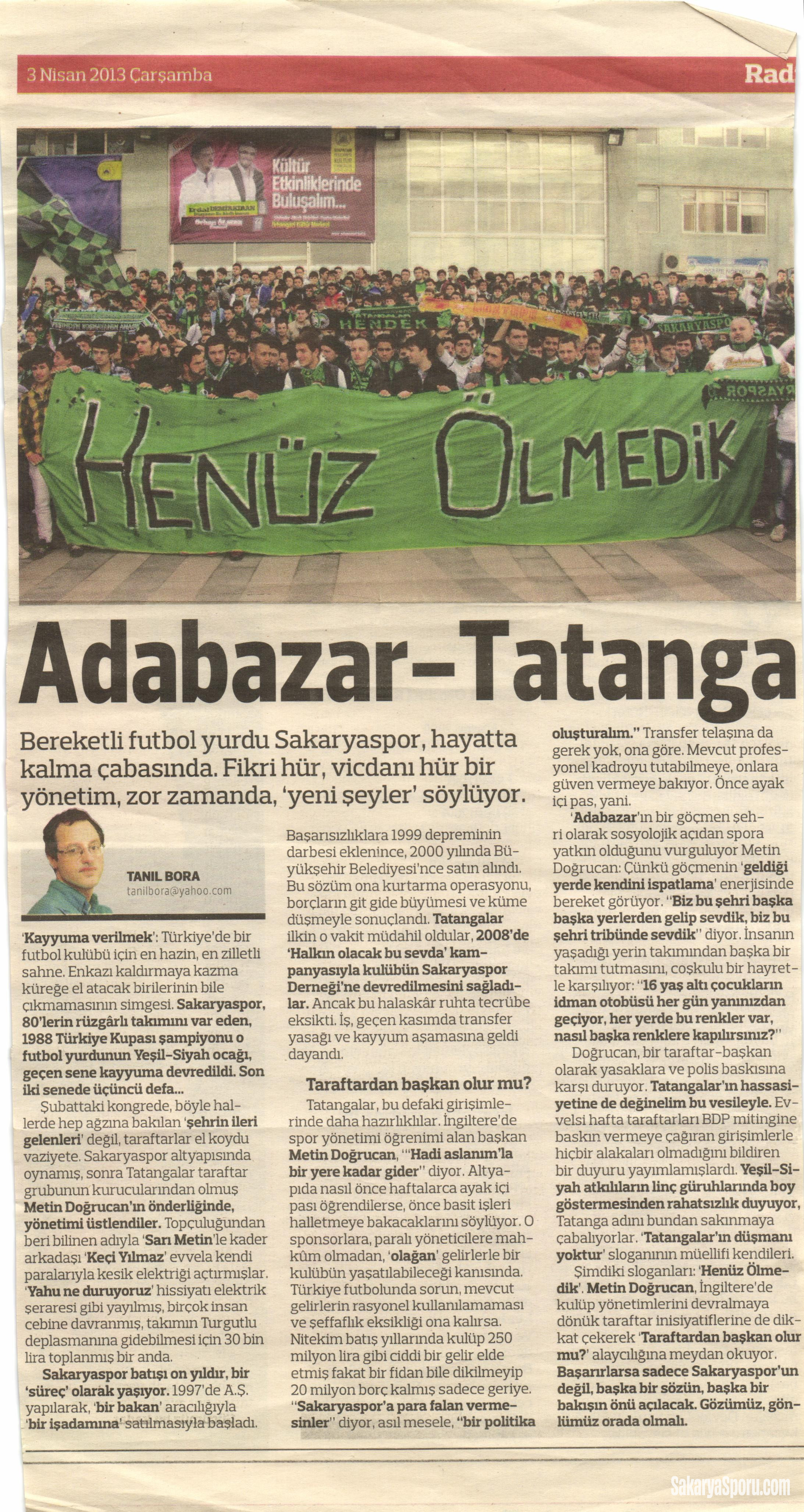Şimdiki sloganları: ‘Henüz Ölmedik'. Metin Dogrucan, İngiltere'de kulüp yönetimlerini devralmaya dönük taraftar inisiyatiflerine de dikkat çekerek Taraftardan başkan olur mu?' alaycılığına meydan okuyor. Başarırlarsa sadece Sakaryaspor’un değil, başka bir sözün, başka bir bakışın önü açılacak. Gözümüz, gönlümüz orada olmalı.