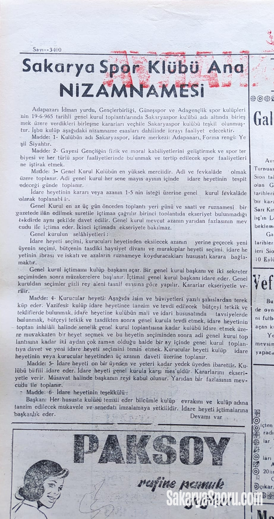 Adapazarı İdman yurdu, Gençlerbirliği, Güneşspor ve Adagençlik spor kulüplerinin 19-6-965 tarihli genel kurul toplantılarında Sakaryaspor kulübü adı altında birleşmek üzere verdikleri birleşme kararları veçhile Sakaryaspor kulübü teşkil olunmuştur. İşbu kulüp aşağıdaki nizamname esasları dahilinde icrayı faaliyet edecektir.