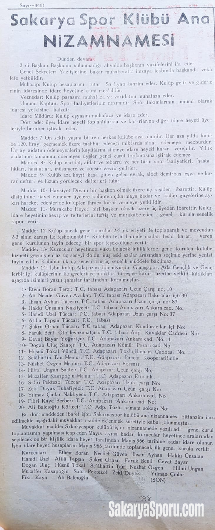 Muvakkat madde: Sakaryaspor kulübü işbu nizannamede yazılı adi genel kurul toplantısının yapılması icap eden Mayıs ayma kadar kurucular heyetince aralarından seçilecek on bir kişilik idare heyeti tarafından Mayıs 966 tarihine kadar idare olunur İşbu idare heyeti hesaplarını. Mayıs 966 tarihinde toplanacak ilk genel kurula verilir.