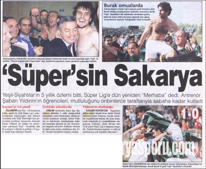 Yıllardır hep play-off maçlarına kalan, ancak bir türlü Süper Ligi yakalayamayan Sakaryaspor nihayet muradına erdi. Sadi Tekelioğlu’nun görevinden ayrılması sonucunda antrenör Şaban Yıldırım ile müthiş bir performans yakalayan yeşil-siyahlılar, dün Kayserispor’un Burak’ın golüyle 1-0 geçti, mutlu sona ulaşmayı başardı.